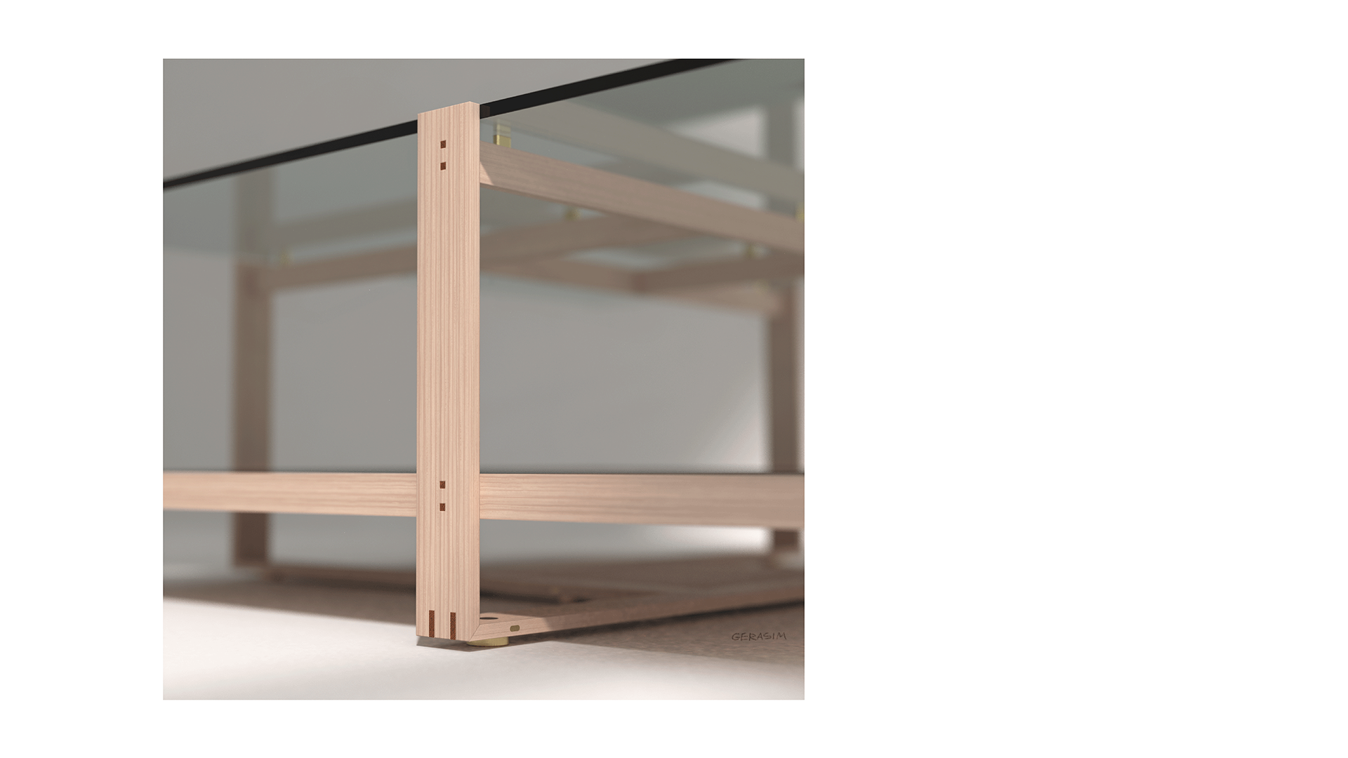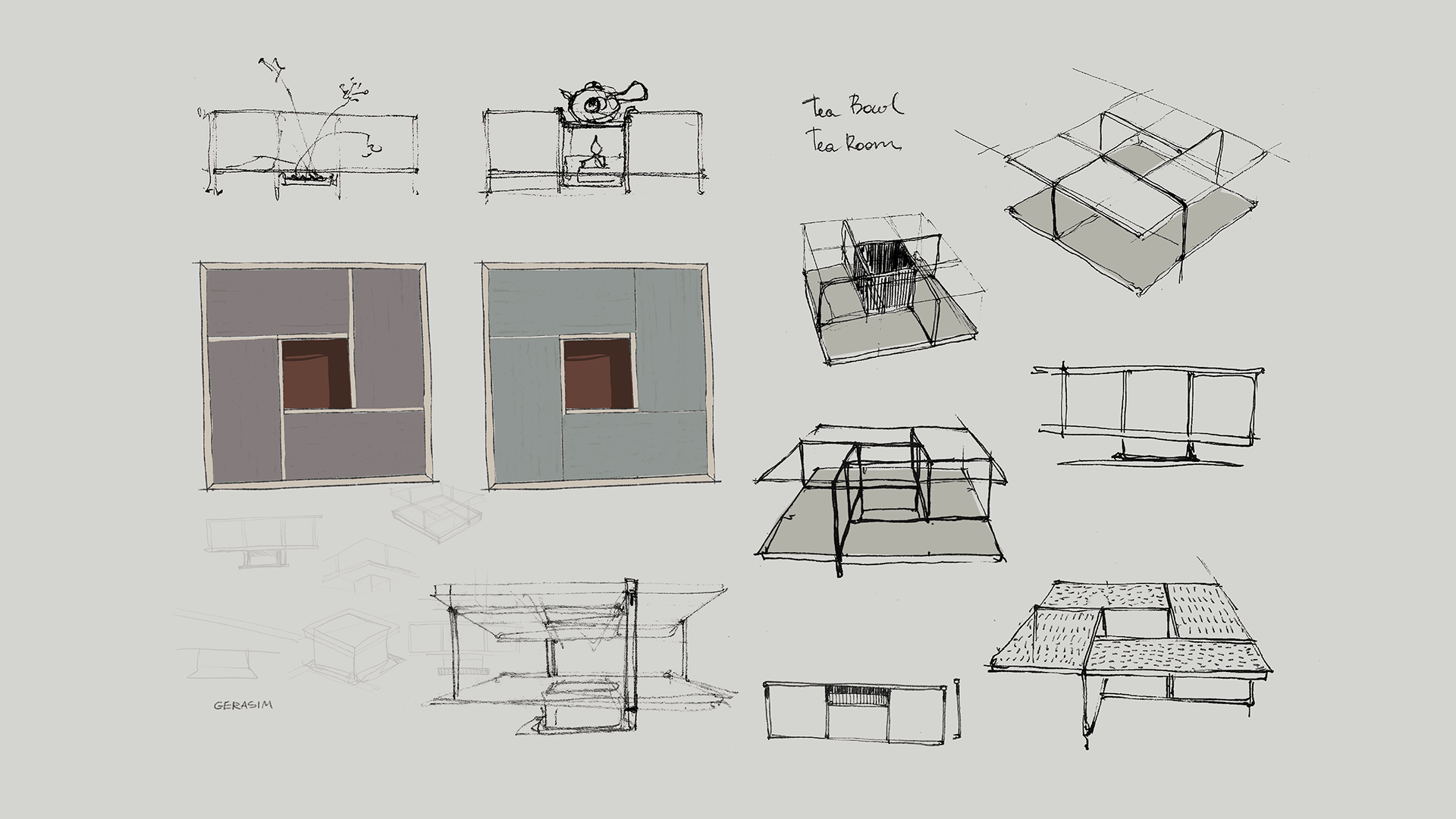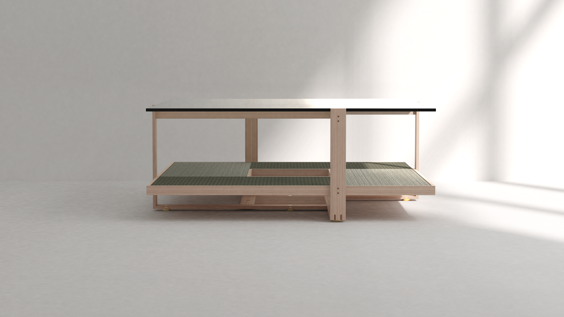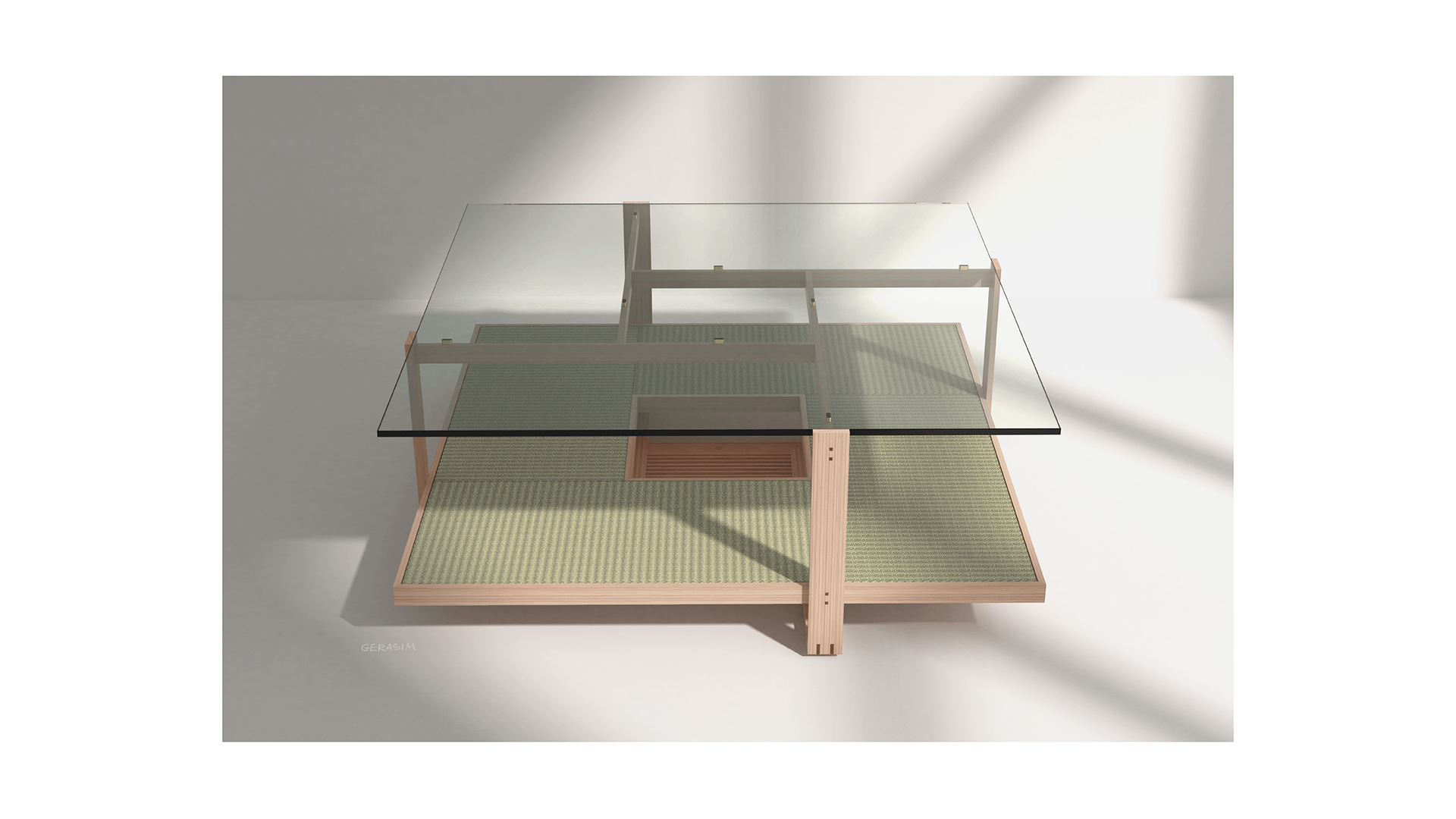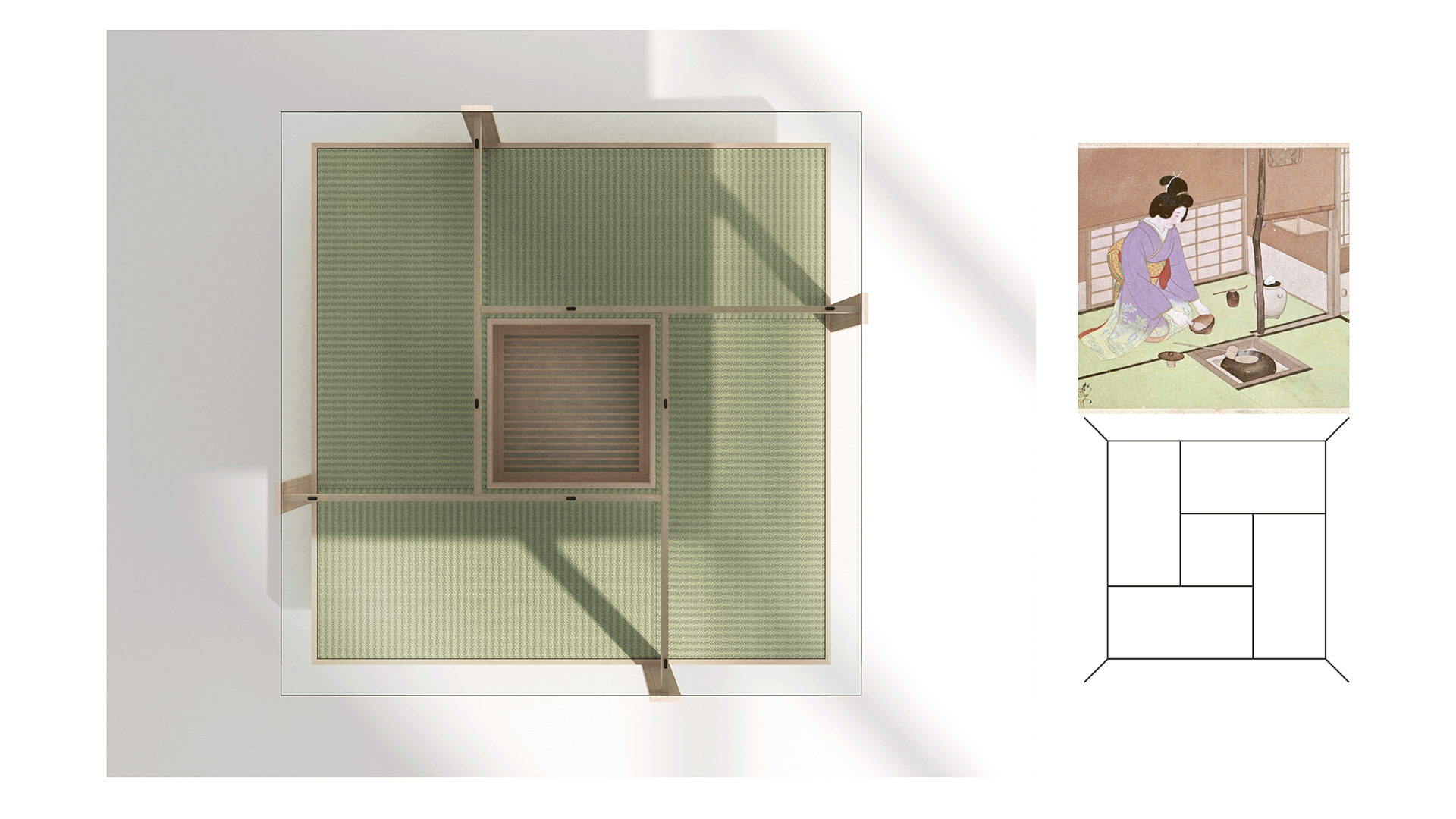 The shape of the table and its materials refers to a traditional Japanese tea room, which is 4 1/2 tatami size.